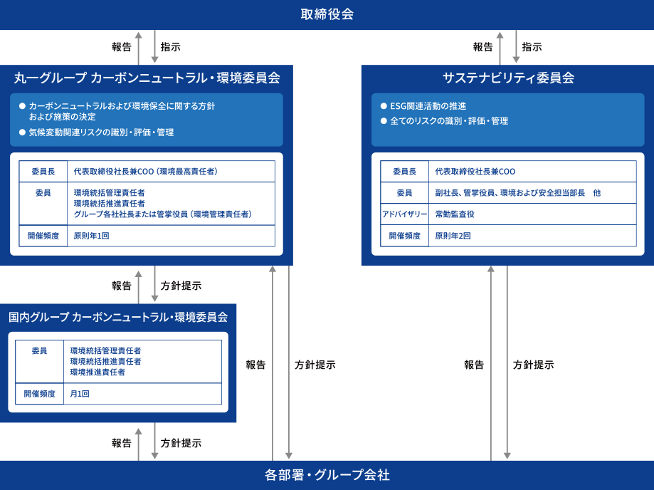 当社は、気候変動などの地球環境問題や環境関連諸法令などを踏まえ、当社グループにおける中長期的な方向性や目標を審議し、CO2排出量の削減やその他環境負荷の軽減など環境関連の諸課題への対応を迅速に推進するために、国内外グループ各社に環境管理責任者を置き、当社社長を(環境最高責任者)委員長とする「丸一グループ カーボンニュートラル・環境委員会」(以下「委員会」という。)を設置しています。